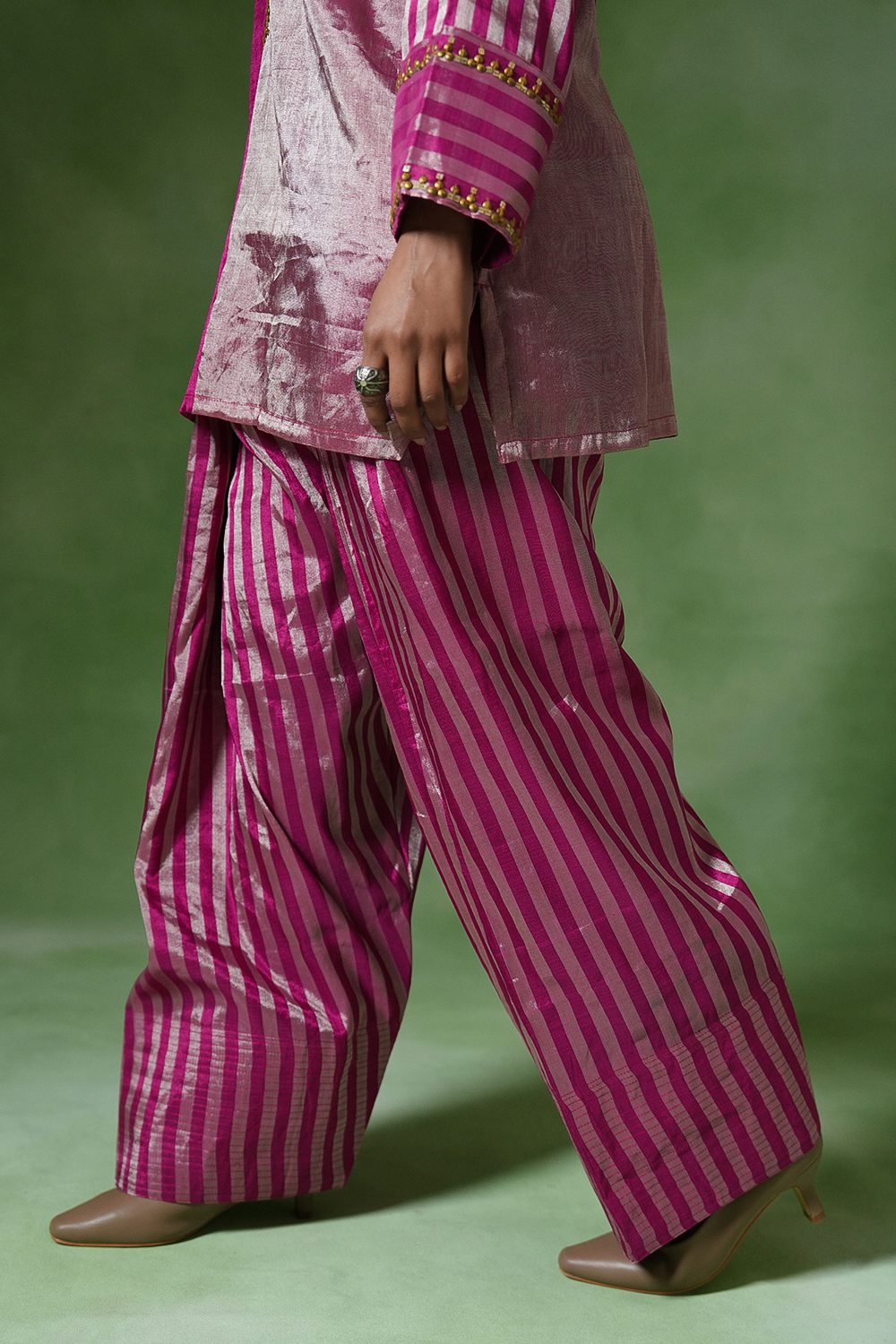 Hand Embroidered Short Kurta with Farshi Salwar in Hand Woven Chanderi Tissue. Kurta and Salwar have cotton lining. Elasticated waist in Palazzo.