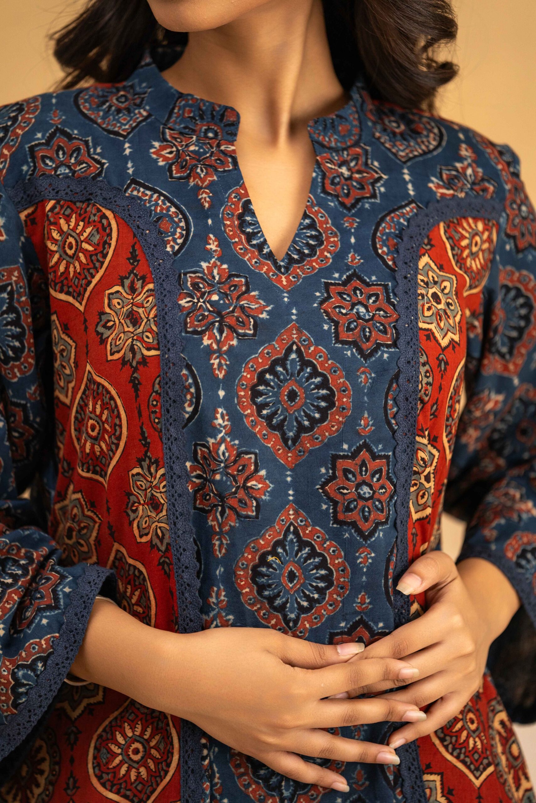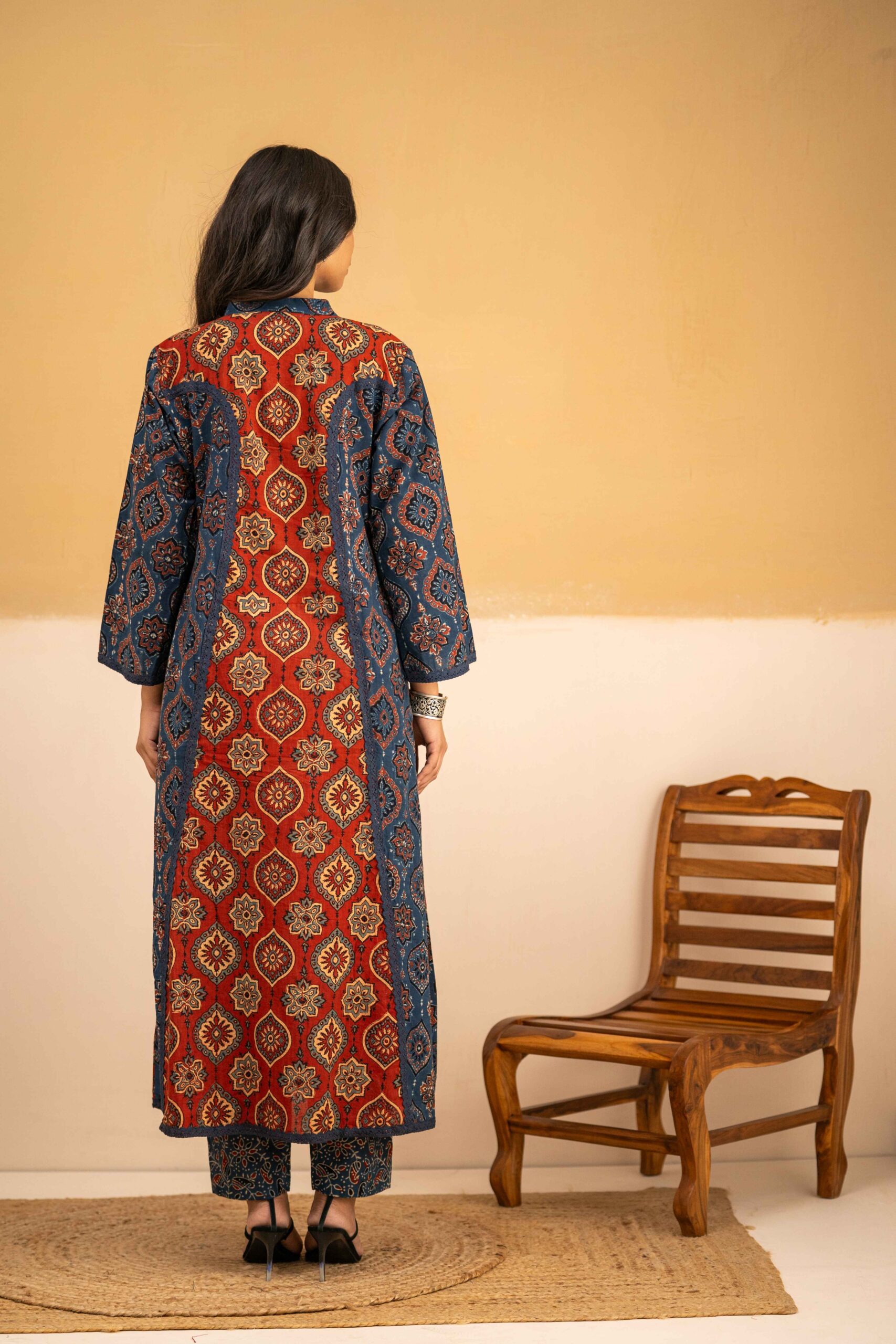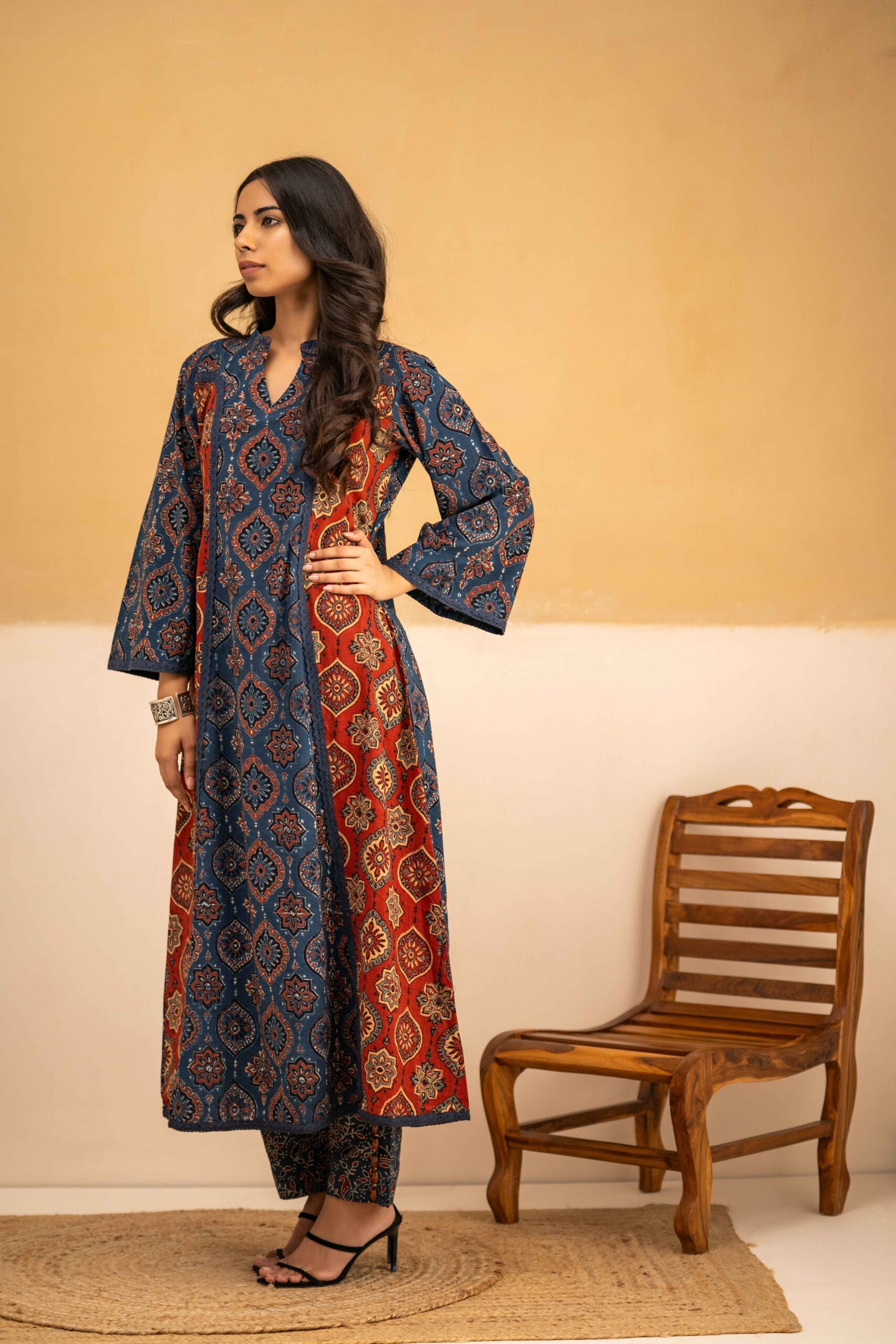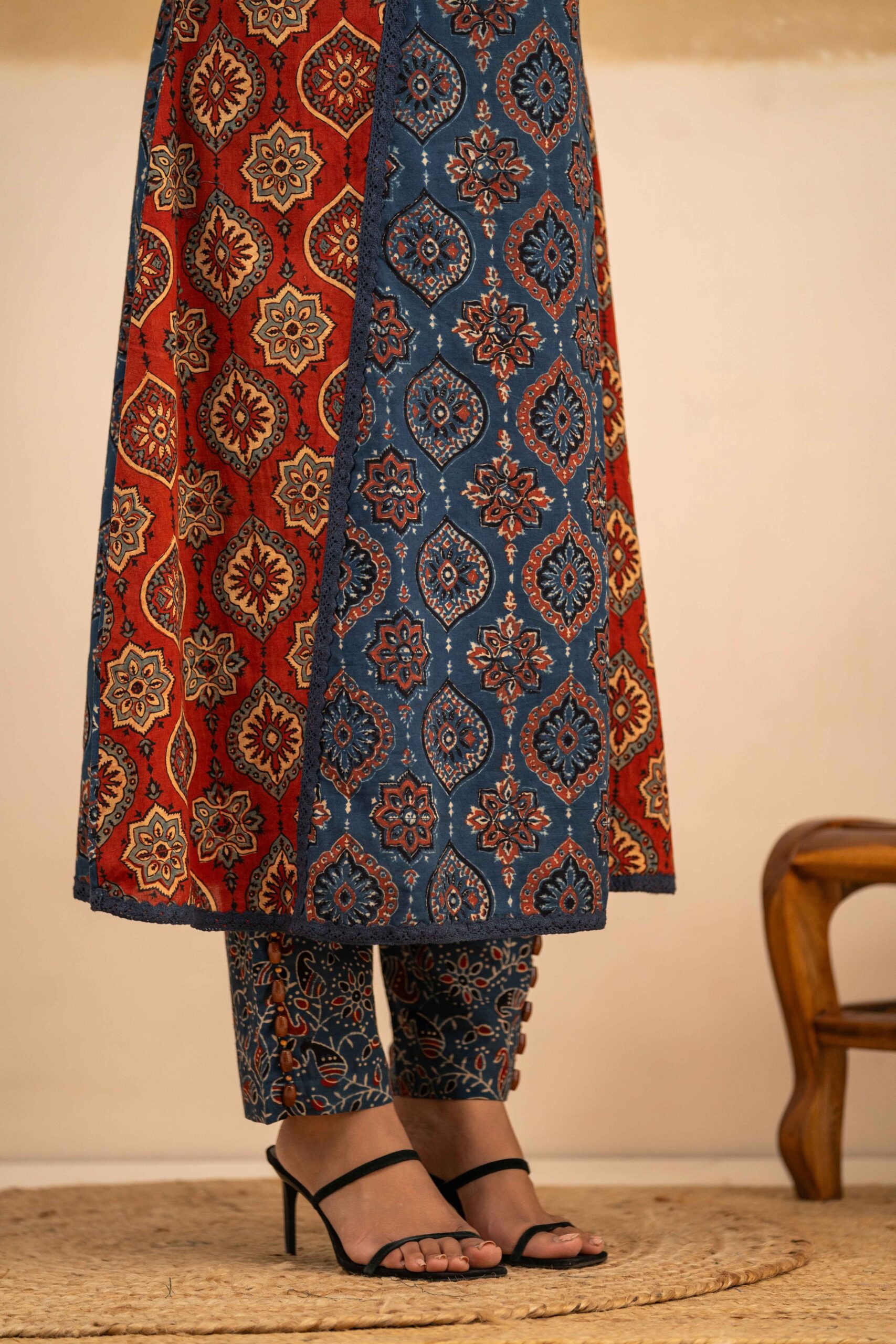 Hand Block Printed Ajrakh , Umbrella 3/4th sleeves , V-neck with Half-collar band , crochet cotton lace details , A-line flare shape for comfort-fit , pockets on the side , wooden beads on the sides of the pants