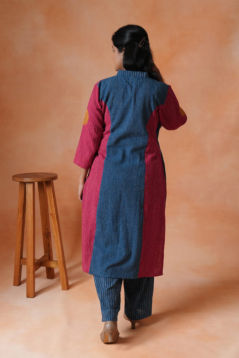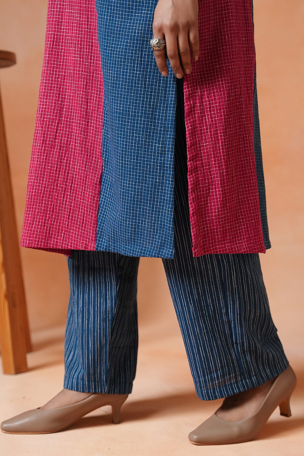 Hand woven Kala Cotton Straight kurta with V-neck, 3/4th sleeves and side pockets paired with Indigo kala cotton pants. Highlight of this co-ord set is the hand embroidery adding a pop of color, making the set just perfect for everyday premium wear.