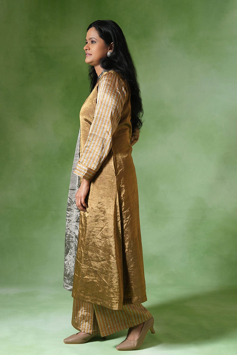 Hand Embroidered A-Line Tunic with Palazzo in Hand Woven Chanderi Tissue. Tunic and Palazzo have cotton lining. Elasticated waist in Palazzo.