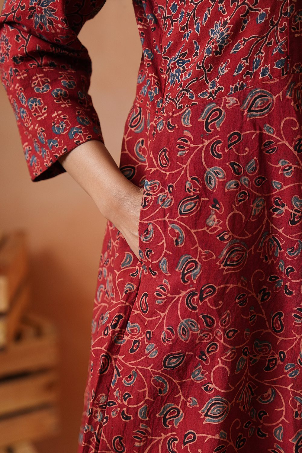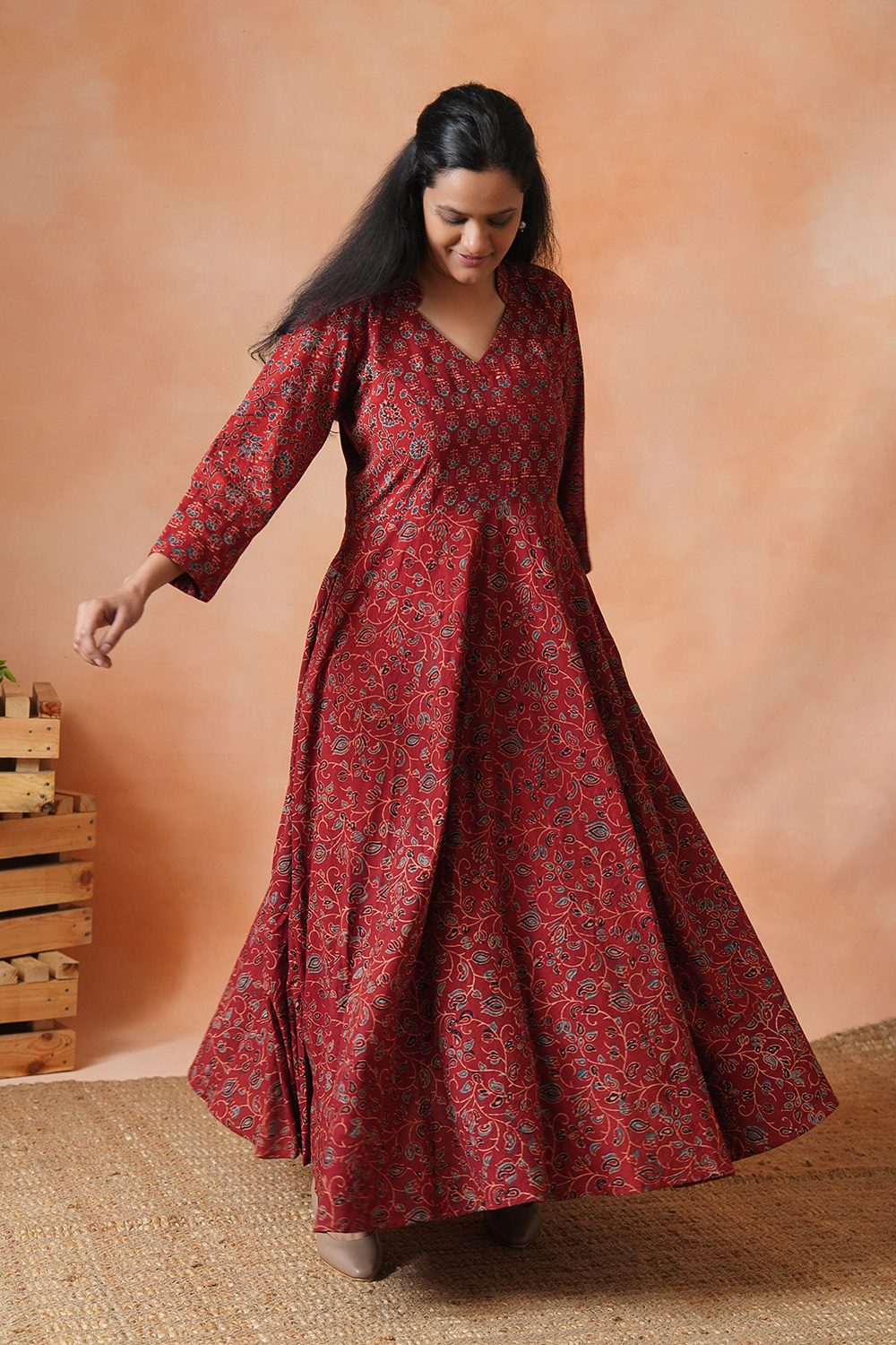 Hand Block Printed Ajrakh in Cotton Fabric. Maroon Flared Long Kurta with Half collar and V-neck and 3/4th sleeves and one-side pocket with elasticated Palazzo in cotton ajrakh fabric.